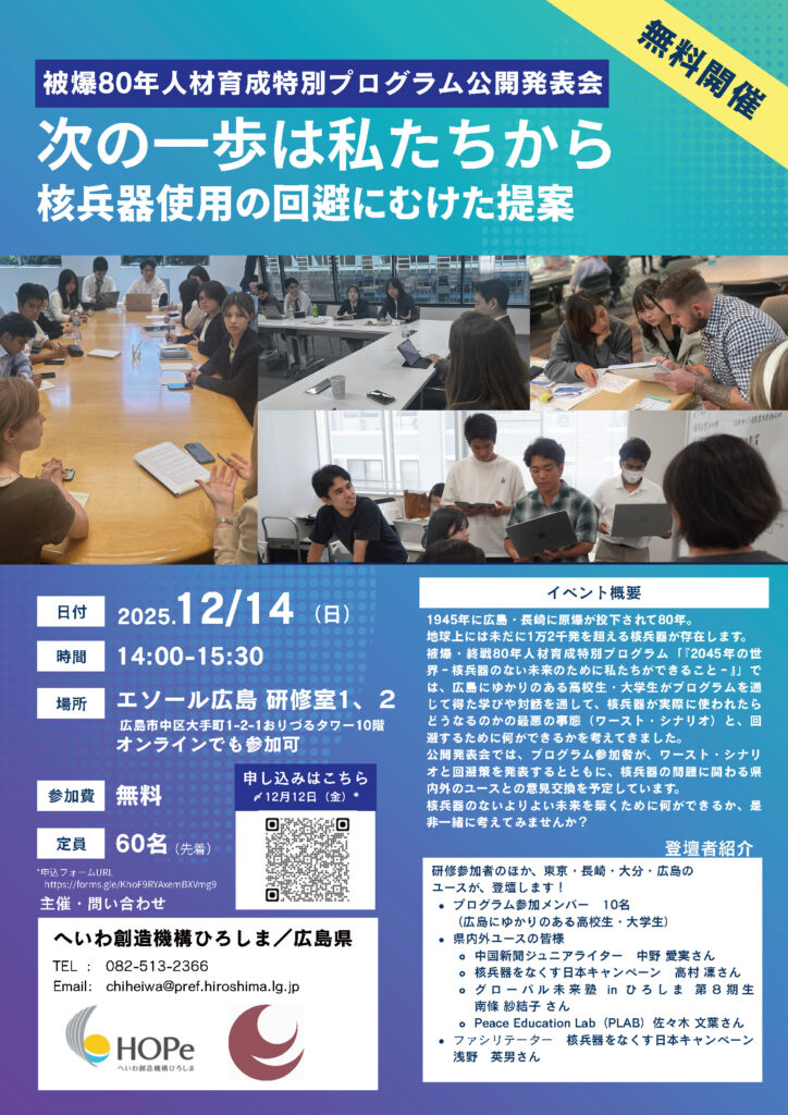 へいわ創造機構ひろしまと広島県が主催する、被爆80年人材育成特別プログラム公開発表会「次の一歩は私たちから 核兵器使用の回避にむけた提案」にPLABメンバーの佐々木文葉さんが登壇します。
